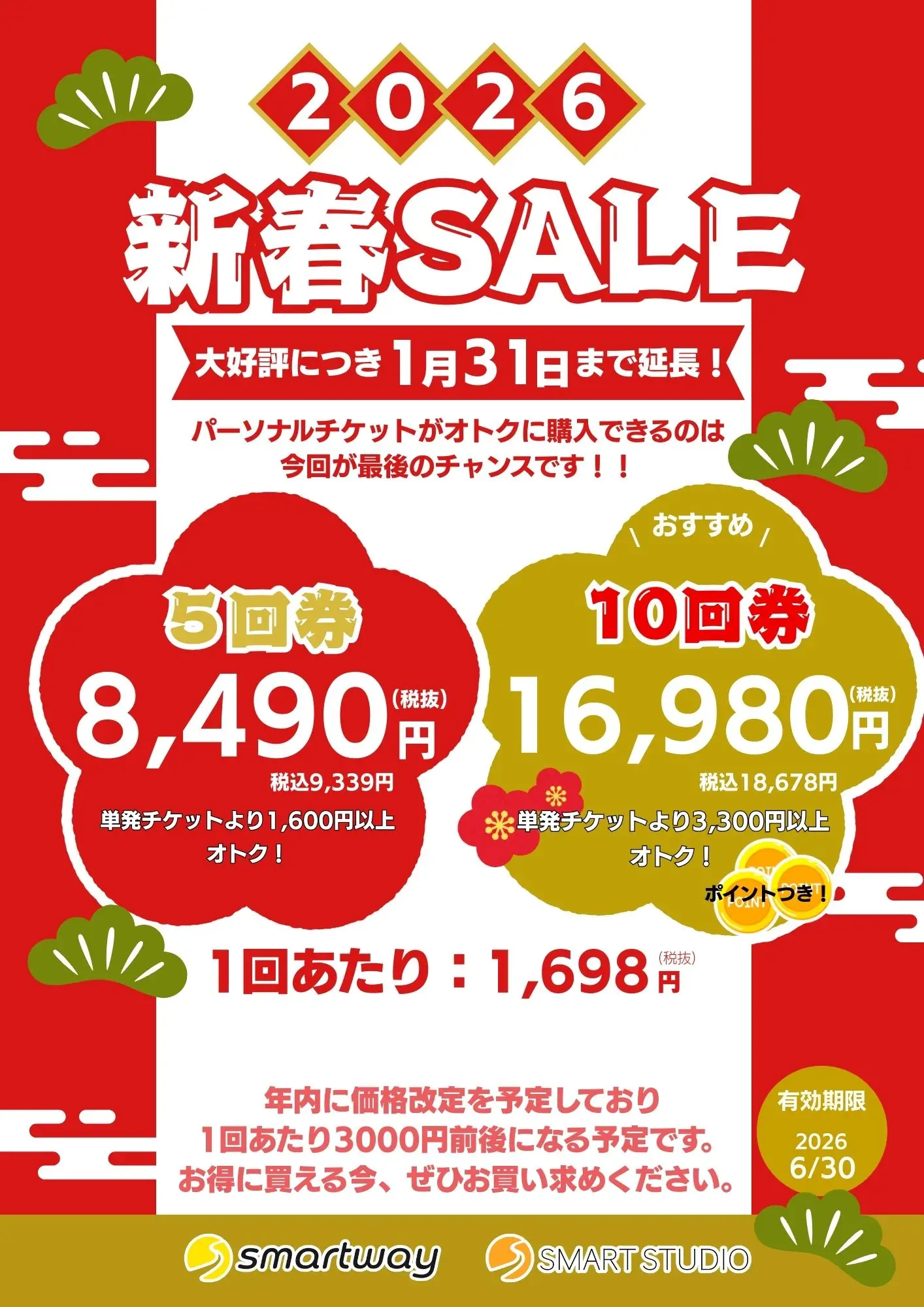 そして、今年から価格改定を予定しておりパーソナルトレーニングも“値上げ”予定です。お得にレッスンを受けられるぜひこの期間中にお買い求めください。
