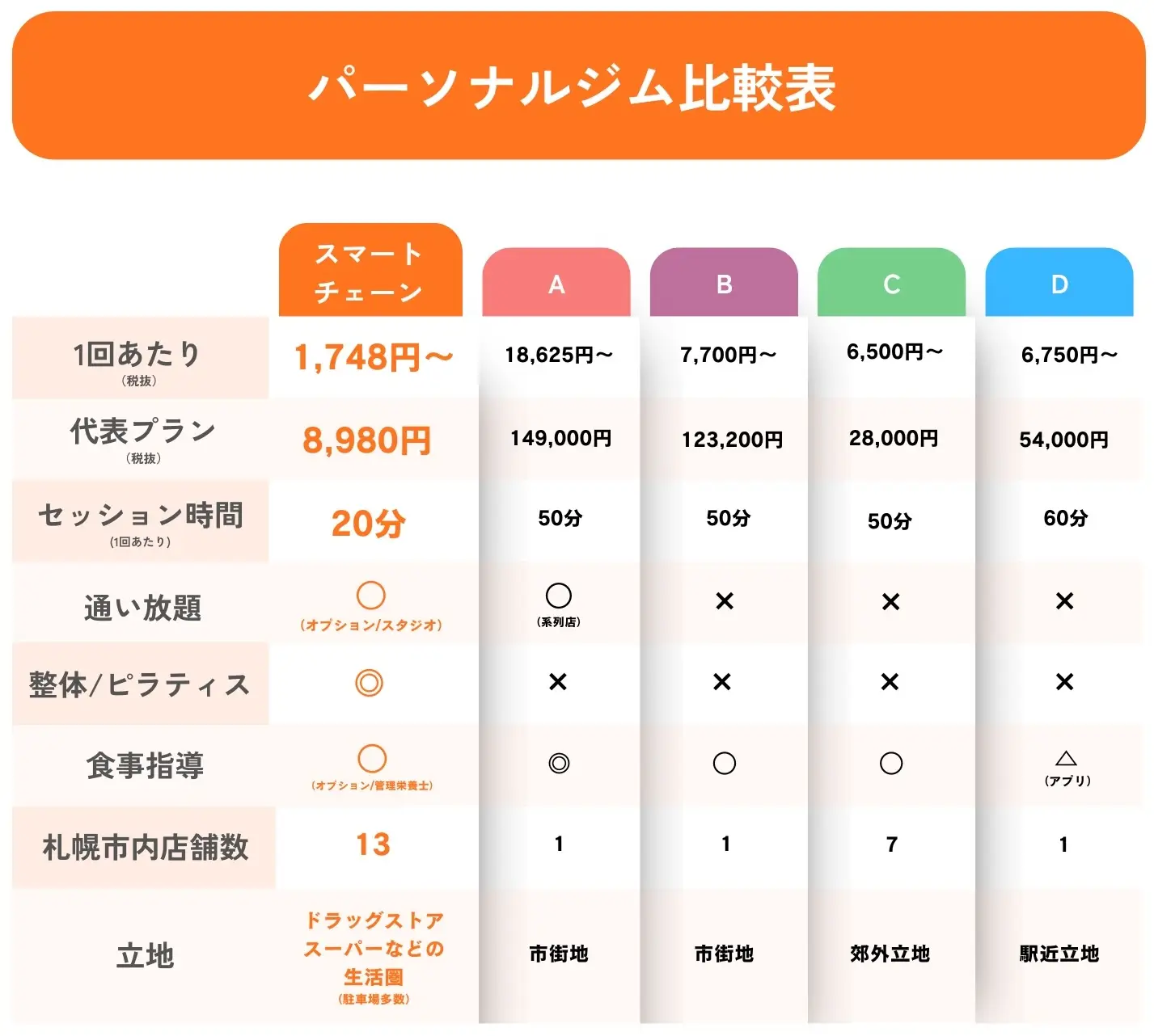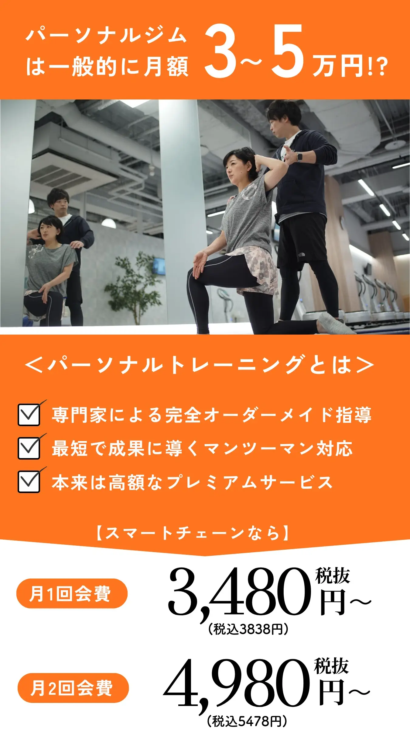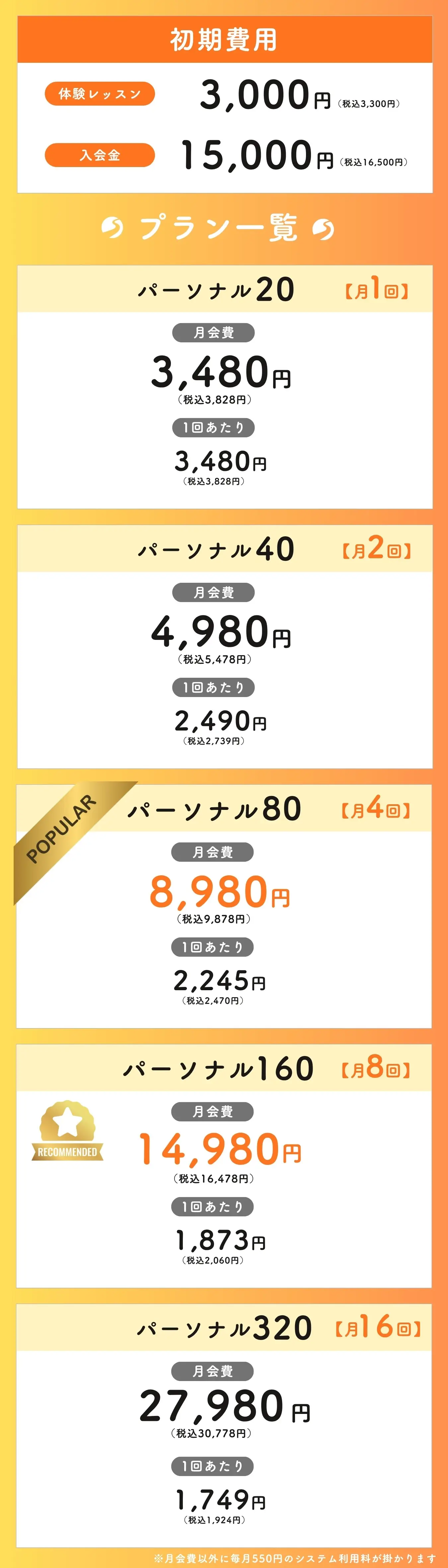 ※さらにコーチ指名&全店利用を希望する場合330円(シルバー)。全プログラム選択を希望する場合は440円(ゴールド)がパーソナル回数分掛かります。あらかじめご了承ください(最初の2ヶ月間はゴールド無料特典があります)