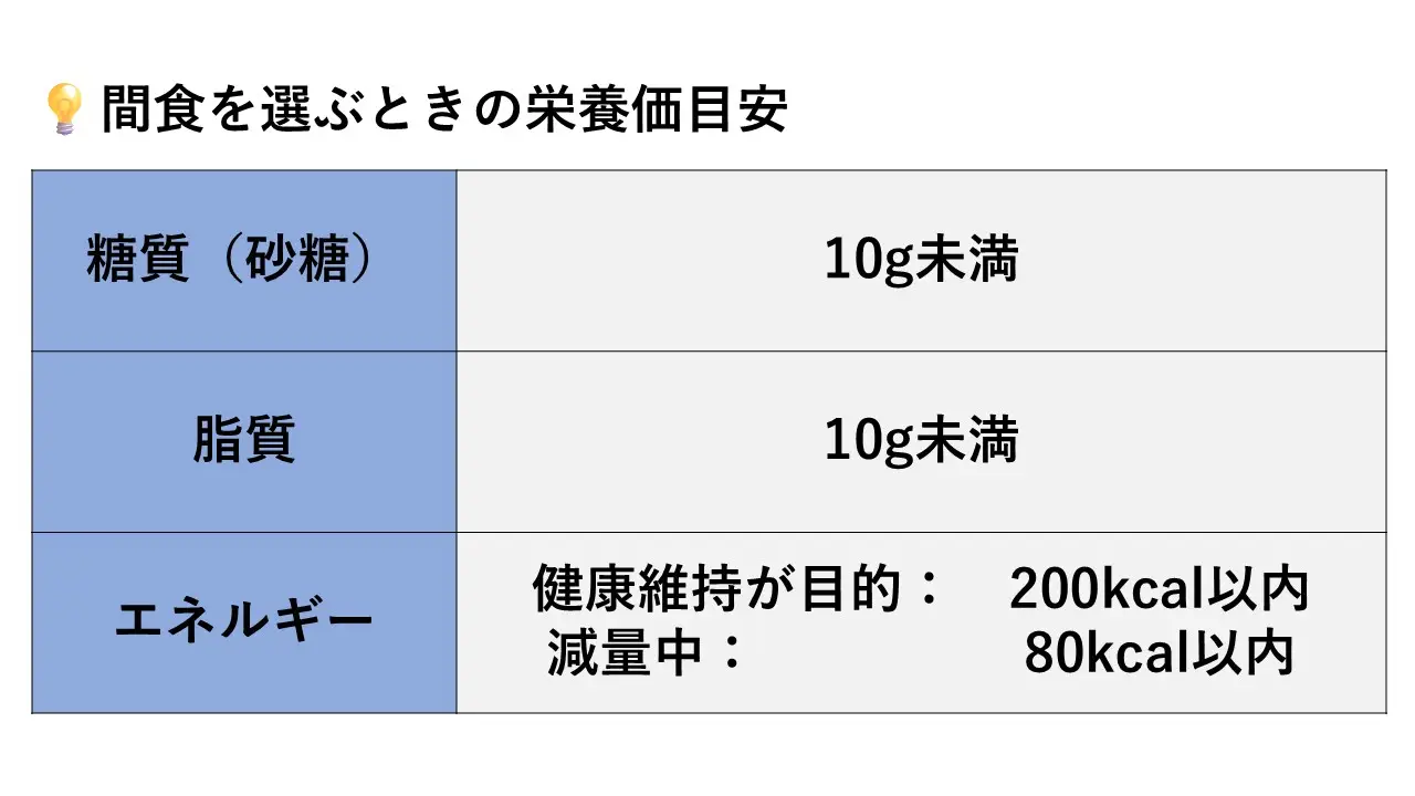 また、国立国際医療研究センター 糖尿病情報センターでは、実践的な間食のコントロールとして「80kcal前後」を目安に挙げています。