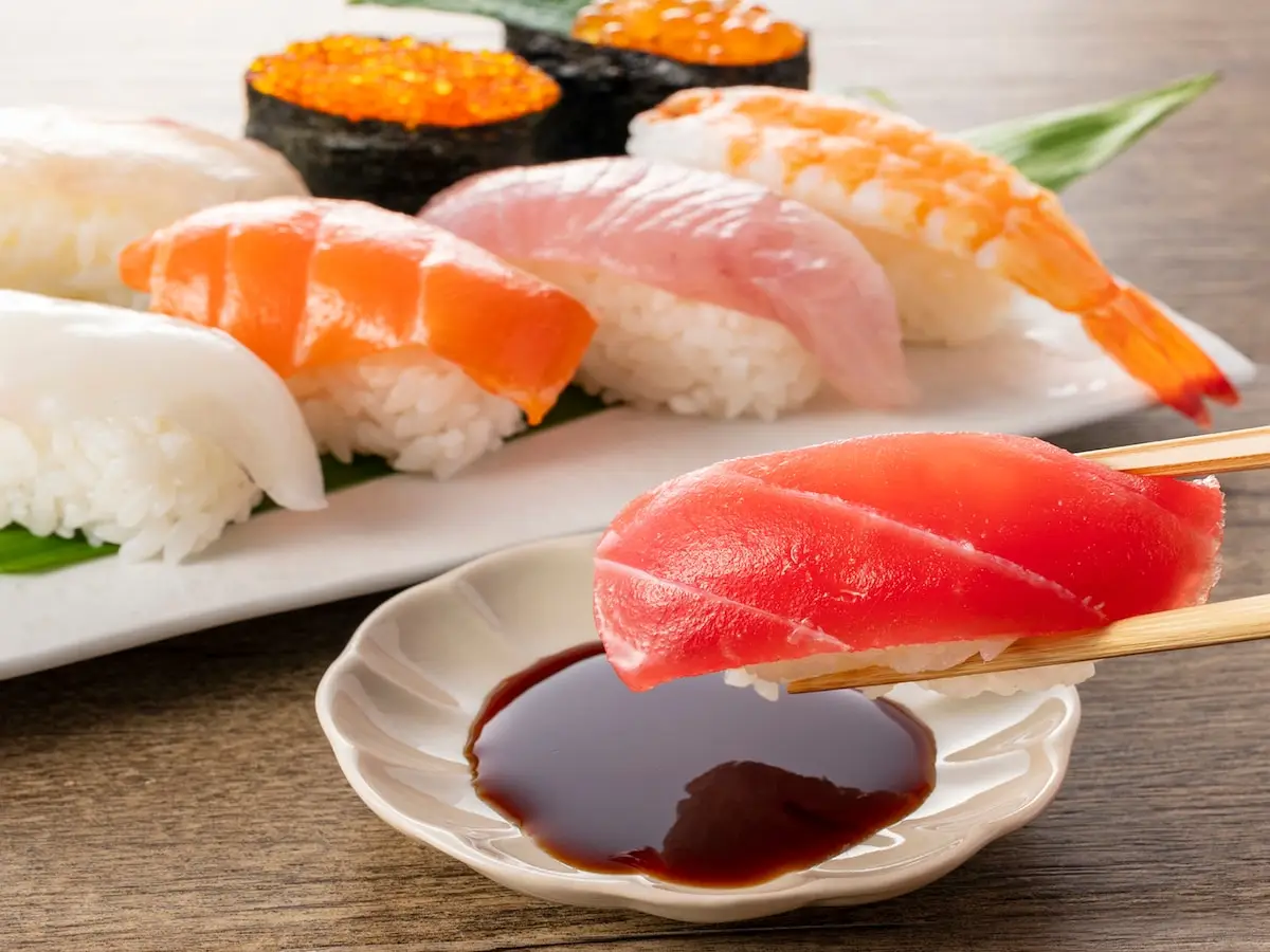 お寿司は食べるお店によってネタや酢飯の大きさが異なります。一般的なネタの重量は約5~15gで、摂取できるタンパク質は約1.5g~3.0gです。男性であれば8貫、女性なら6貫を食べると、タンパク質の推奨量を摂取できます。しかし、酢飯には砂糖が使われていることや、つい食べ過ぎてしまいがちなことから、摂取エネルギー量が多くなる傾向にあります😣