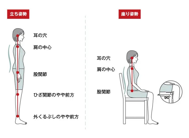 立ち姿勢の時は耳の穴・肩の中心・股関節・膝関節のやや前方・外くるぶしのやや前方が一直線。