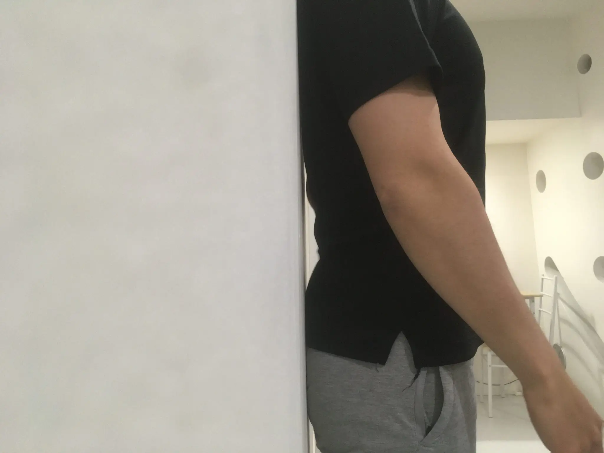 壁によりかかり、後頭部、肩、背中、お尻、かかとをつけて立ち、腰と壁の間に握りこぶしの状態の手を入れる