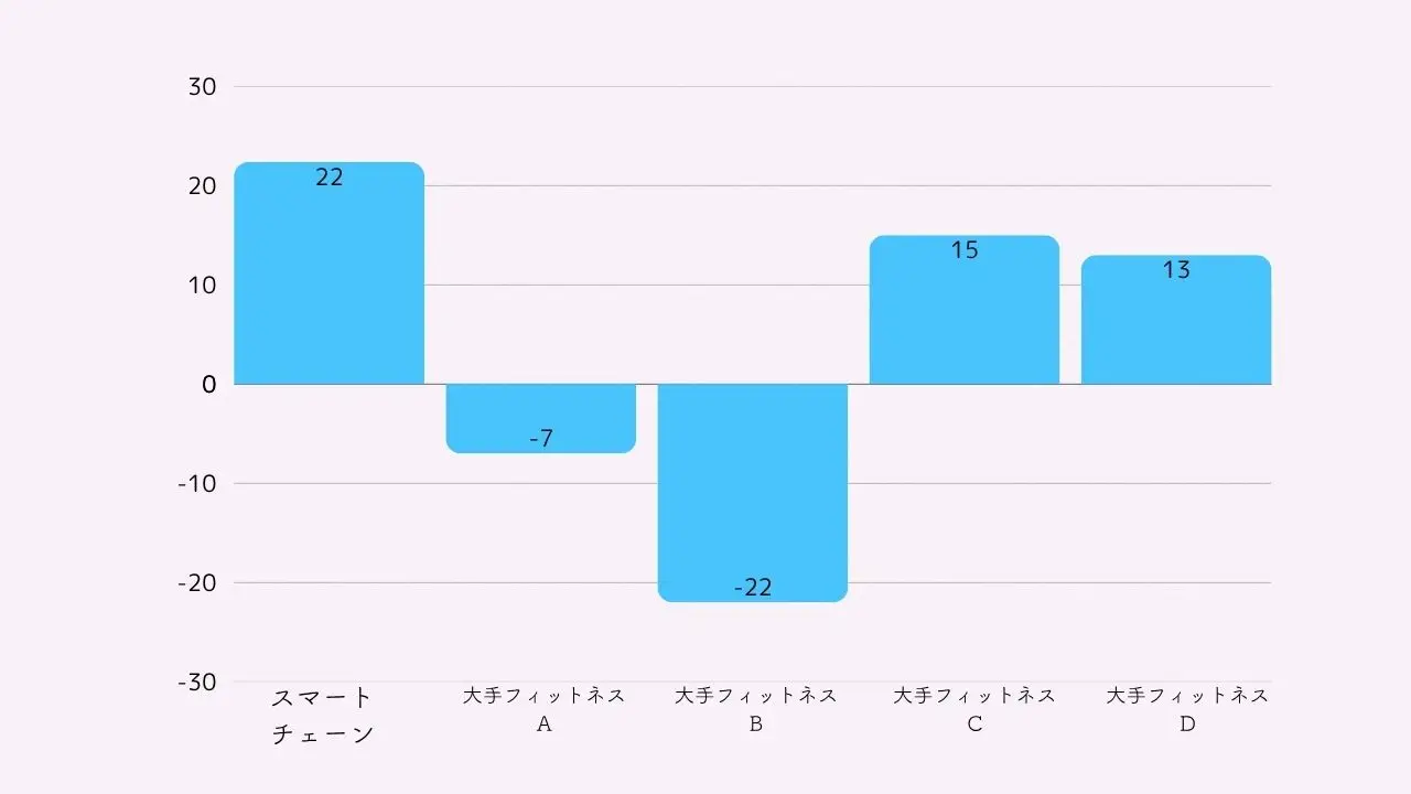 以下のグラフは、スマートチェーンを含めた大手フィットネスジムのNPSの結果です。誰もが知っているフィットネスジムでもマイナスがつきますし、プラスであること自体がかなりの高評価といわれています。