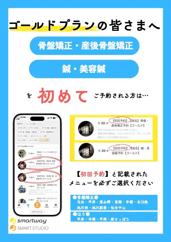 - スマートケアの「骨盤矯正」「鍼・美容鍼」を初めてご利用される方は、【初回予約】からご予約をお願いいたします。2回目以降のご予約は通常予約からご予約ください。