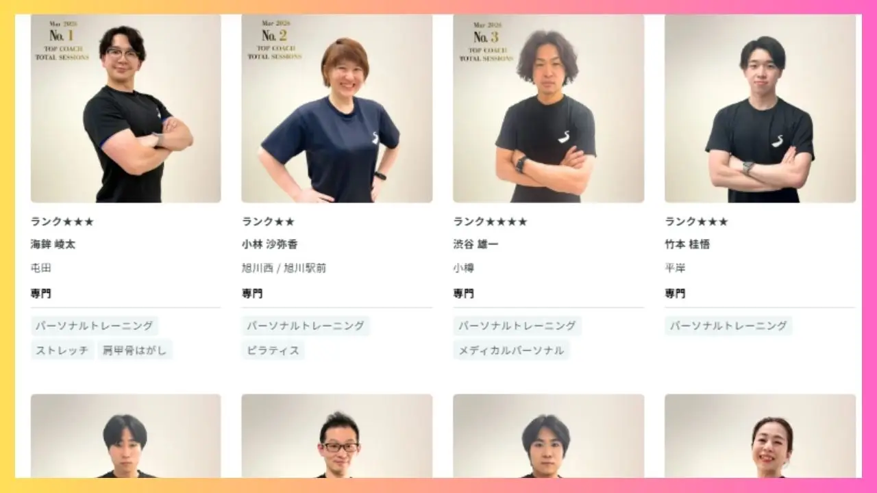 豊富な経験と高い専門性を持った★4のトップコーチによるパーソナルトレーニング(トップコーチ一覧はこちら)